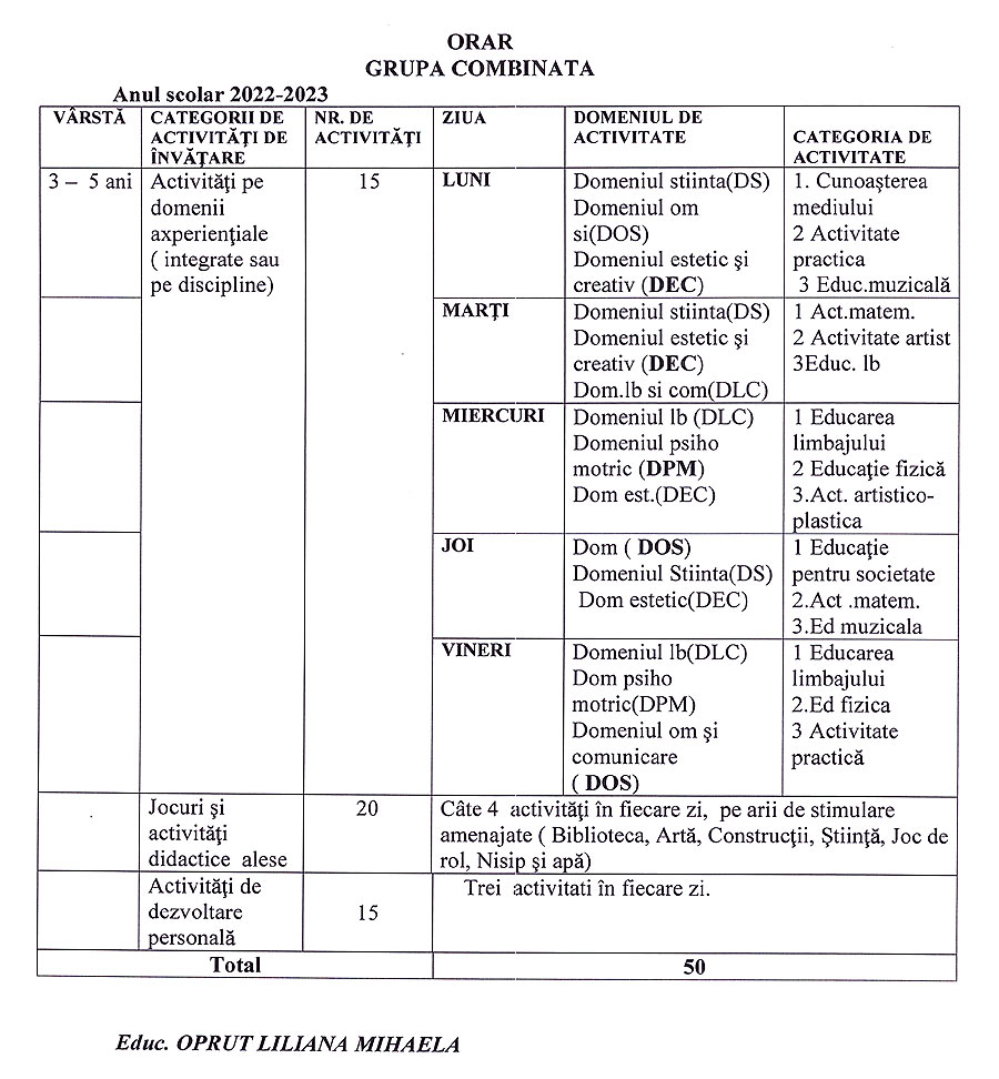 GRĂDINIȚA PROGRAM NORMAL PĂCLIȘA – 11 preșcolari, grupă combinată